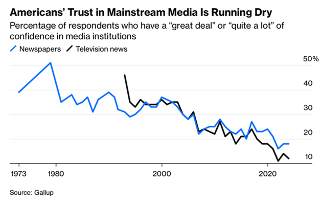 Quite simply, it is not a healthy trend. Americans' confidence in newspapers peaked at 50% in 1980 and is at a dismal 15% today. Similarly, the American trust in TV news has also fallen from a peak of 45% in 1995, to an even worse 10% today.